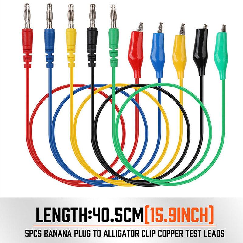pPerfect leads for power supply or scope connections for multiple connections.br data-mce-fragment1The alligator clips are both crimped and soldered for secure and reliable performance.br data-mce-fragment1Banana Plug to Alligator Clip Test Lead cables can be used in electrical or electrical laboratory test work.br data-mce-fragment1Banana Plug to Alligator Clip Test Lead cables is often used in school physics labs to quickly and inexpensively assemble circuits.br data-mce-fragment1They are useful for connecting components to wires.br data-mce-fragment1The alligator clips are strong and the wire is strong yet flexible.br data-mce-fragment1The test lead pin is made from stainless steel and comes in 3 types straight, 135 and 90 degrees.br data-mce-fragment1If youre an auto technician then you need to add these to your toolbox.ph3Specificationh3pVoltageCurrent30V5A.br data-mce-fragment1Banana Plug size 4mmbr data-mce-fragment1Wire Lenth 40.5cmbr data-mce-fragment1Cable Material soft PVCbr data-mce-fragment1Application Testingph3Package Includesh35 Banana plug to Alligator Clips Leadsbr data-mce-fragment13 Red probe leadsbr data-mce-fragment13 Yellow probe leadsbr data-mce-fragment13 Black probe leadsbr data-mce-fragment13 Green probe leadsbr data-mce-fragment13 Blue probe leadsbr data-mce-fragment12 Clips