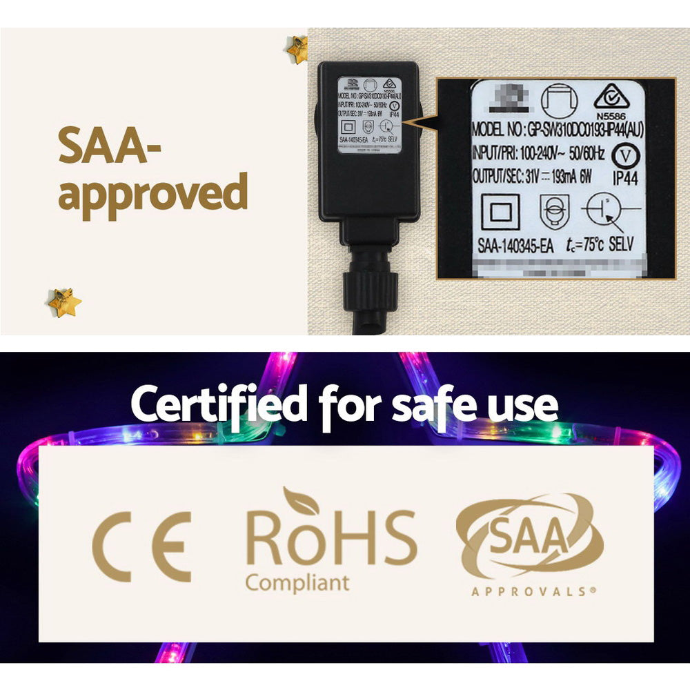 pBring the brilliance of Christmas to your home with our mesmerising Jingle Jollys LED Christmas Tree. A rope light with 36 multi-coloured LED bulbs per metre spirals up the tree-shaped metal frame to the star on top. The LED bulbs flash brilliantly to light up your festive spirit, and you can adjust the speed to suit your preference. The 8m long power cable gives you more flexibility on where you can set up the tree. Place it indoors in your living room, or outdoors in the front yard for all your neighbours appreciate. Create a lively and bright Christmas ambience throughout the season.br Counting down to Christmas Get yours early to avoid busy logistics when approaching ChristmasppstrongFeaturesstrongbr 3D vivid figurebr UV-resistant LED lightbr Twinkling effectbr Sturdy all-weather steel frame constructionbr 5M Leading cable enables versatile set upbr Safe touch with low voltage assurancebr Water resistant, suitable for both indoor and outdoor use br Plug Transformer must be placed in dry areasppstrongSpecificationsstrongbr Leading cable length 5mbr Light bulb typeMulti-coloured LEDbr LED bulb count288br Overall dimensions 50cm x 50cm x 188cmbr Assembly required Yesbr No. of packages 1ppstrongPackage Contentstrongbr Jingle Jollys LED Christmas Tree X1ppThis product comes with 1 year warrantyp