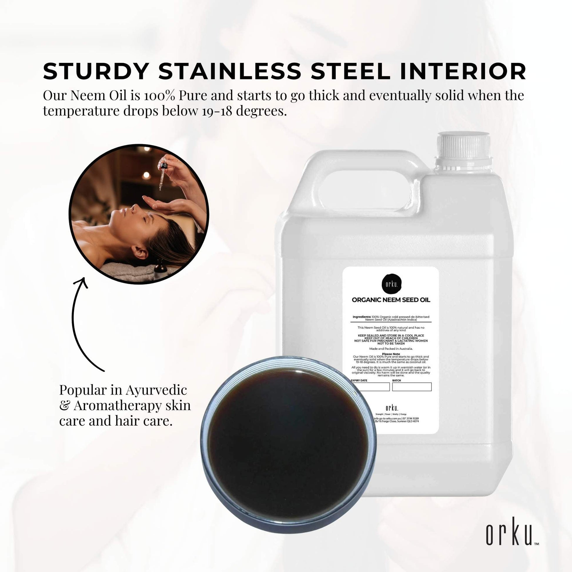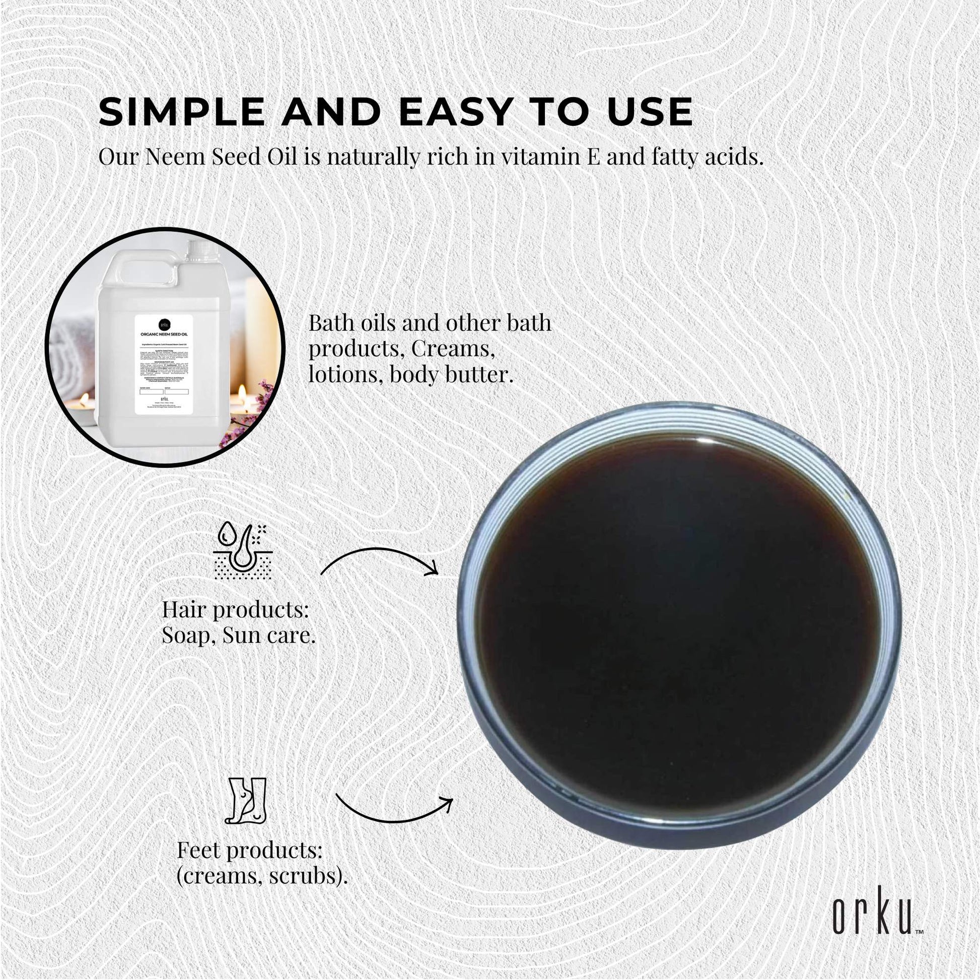 Orku Organic Neem Seed Oil is 100% pure, cold pressed de-bitterised oil with no extractions or additives. It is naturally rich in Vitamin E, contains natural organic Sulphur, proteins, vitamins, glycerine and other trace elements.